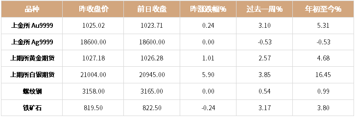 上一交易日,上海黄金交易所黄金现货合约AU99.99收盘价报于1025.02元/克,上海期货交易所黄金期货主力合约AU.SHF收盘报于1027.18元/克。