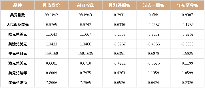 上一交易日在岸人民币兑美元收盘报6.9765。人民币兑美元中间价报7.0103。美元指数涨跌幅为0.29%报99.1842。