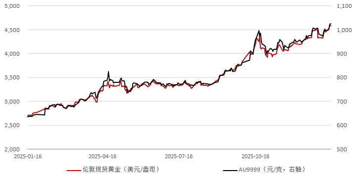 图一:伦敦现货黄金与上金所Au9999收盘价