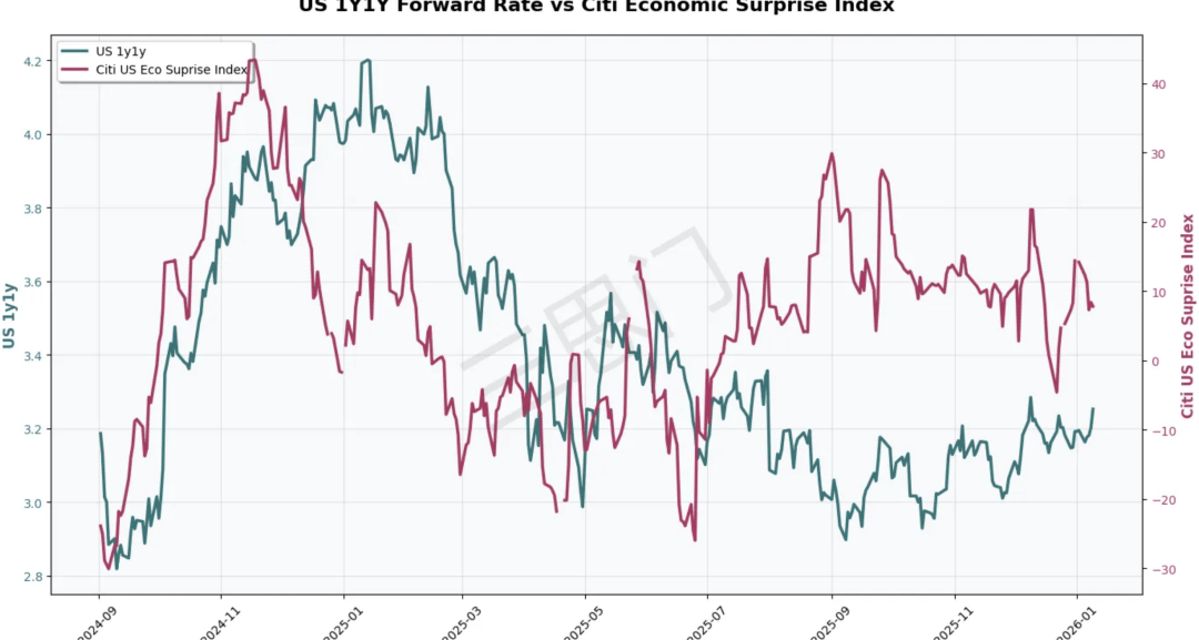 在通胀预期被压住的前提下,美联储依然有理由保持宽松,这也是为什么你会看到,经济数据并不差(下图红线,花旗美国经济惊喜指数),但前端利率(下图绿线)却始终被压在低位。换句话说,基本面没出问题,但它已经不足以单独推动趋势了。