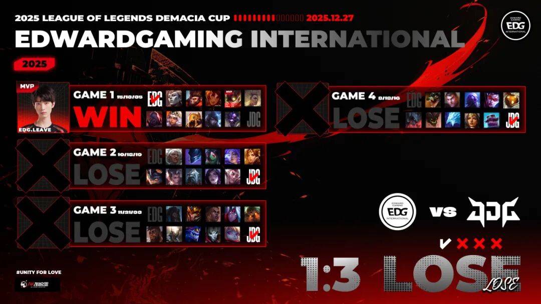 赛后战报丨2025德玛西亚杯EDG 1:3 JDG