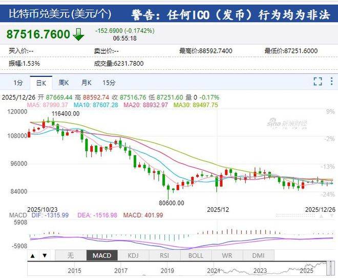 截至12月26日发稿,比特币报87516.76美元。数据显示,24小时,全球共有73643人被爆仓,爆仓总金额为1.04亿美元。