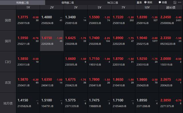 银行间主要利率债收益率全线下行,截至下午16:30,10年期国债活跃券250016收益率下行1.35bp报1.839%,30年期国债活跃券2500006收益率下行3.4bp报2.245%,10年期国开活跃券250215收益率下行2.8bp报1.904%。