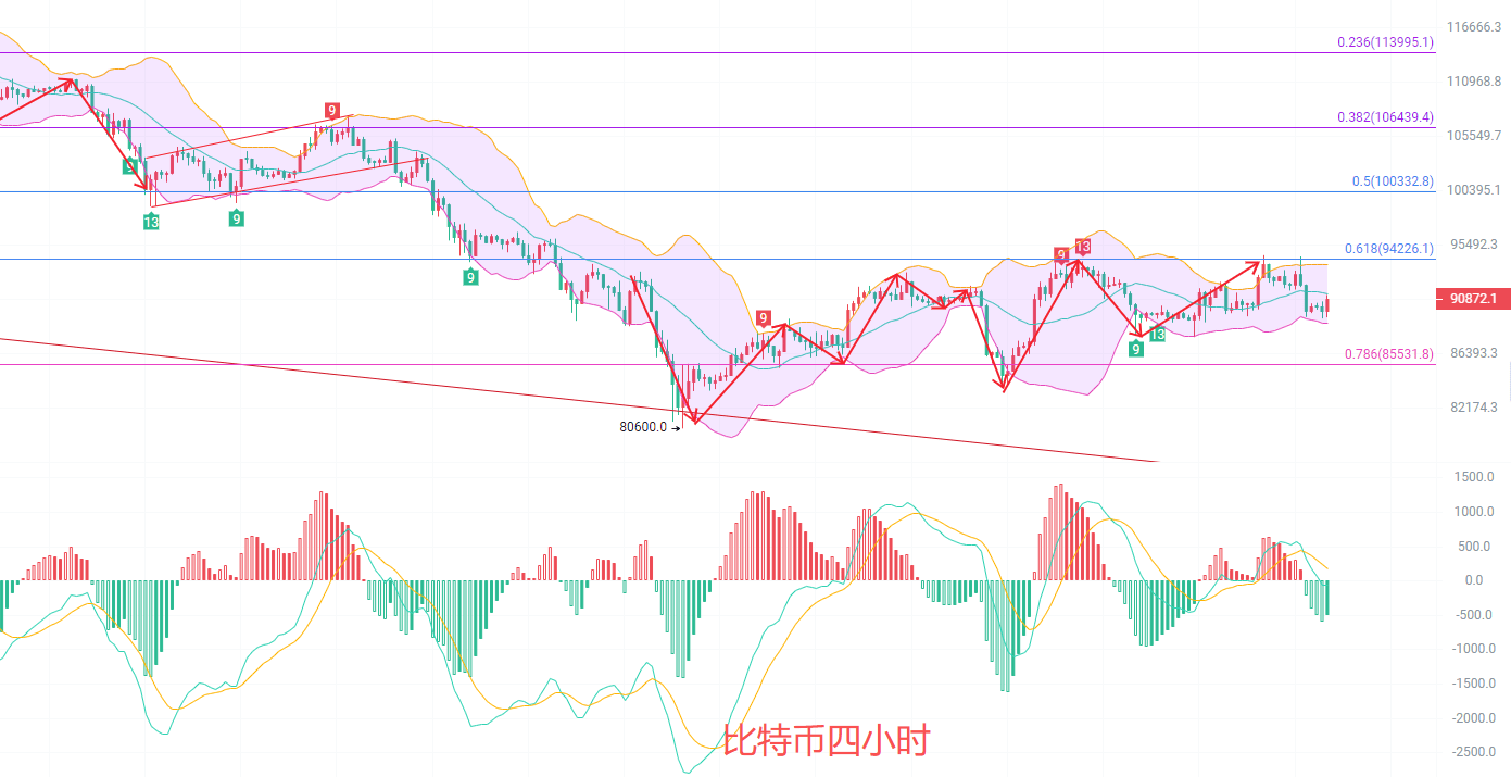 日K线发稿前最高92050,最低89200,EMA趋势指标失守EMA15一线91000,MACD放量但是K线却在回落,DIF和DEA地位向上扩散不变,布林带上轨下压到了94200一线,日K线回踩了布林带中规89900,整体趋势上处于关键的支撑位,若下方失守89900一线形成实体踩踏,那么空势就会延续,反之则会出现反弹看,中线支撑关注85500