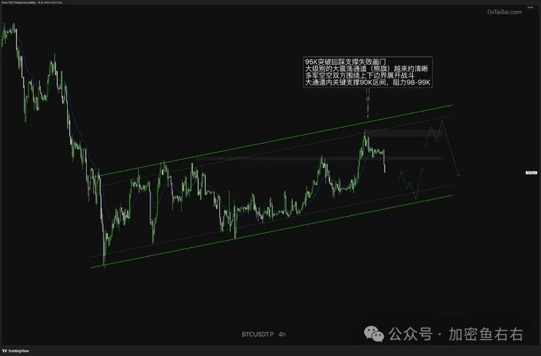 BTC95K突破回踩支撑失败画门。昨晚2h布林开始收窄挤压也是要出大行情的标志,整体行情继续下降趋势。