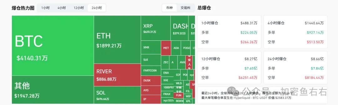 最近24小时,全球共有 242,260 人被爆仓 ,爆仓总金额为 $8.66 亿!今日早盘7:00左右和周五六高点形成顶部信号后,急速跳崖式急跌,直接给市场多头了沉重一击,此刻市场依然在低位徘徊市场犹犹豫豫多空左右菜鸡互啄,唯一有点暂时没有跟进放量来第二波爆跌;