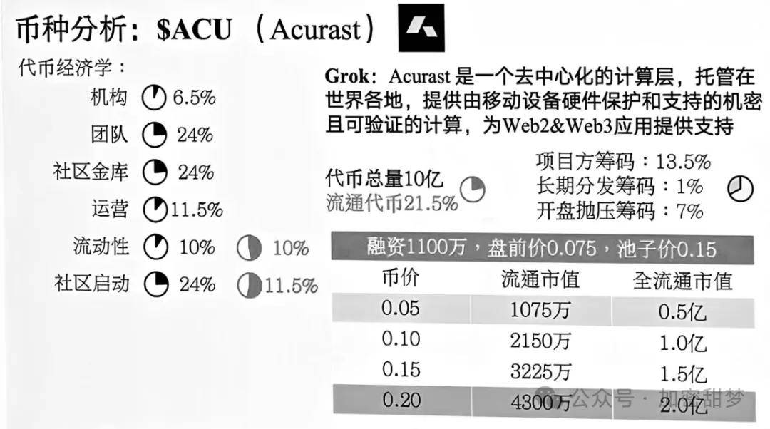 总量 10 亿,初始流通 21.5%,盘前价 0.075,池子价 0.15,总融资:1100 万,分配代币 6.5%,机构平均成本币价为 0.169
