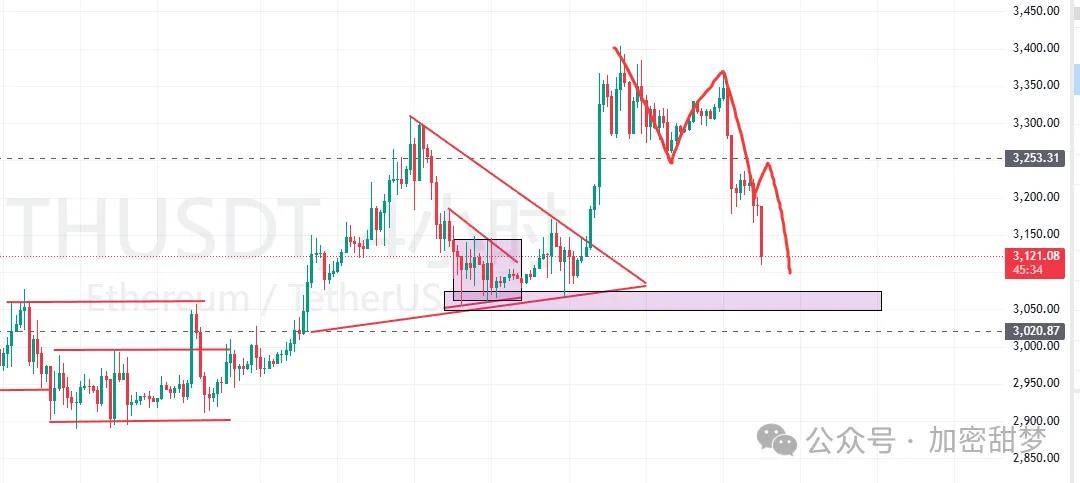 ETH小级别震荡之后再次加速下跌插针,当前盘面最低3109.3,是联动BTC 4H离开段的模式,可反抽空间预计还是1%,自行盯盘止盈,若拉高再下来,3110~3062的支撑依旧有效。