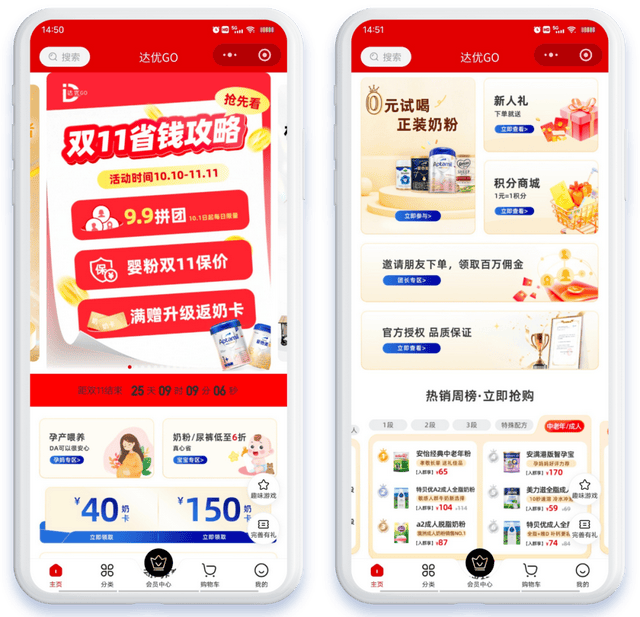 积分能换实用的商品:积分商城里,能换纸尿裤、湿巾这些刚需品,也能换0元试喝奶粉资格,还能换40元、150元奶卡(直接抵钱);会员日、大促时,还能用积分换满减券、优先买新品的资格,让用户觉得积分有用,愿意攒积分、常互动。