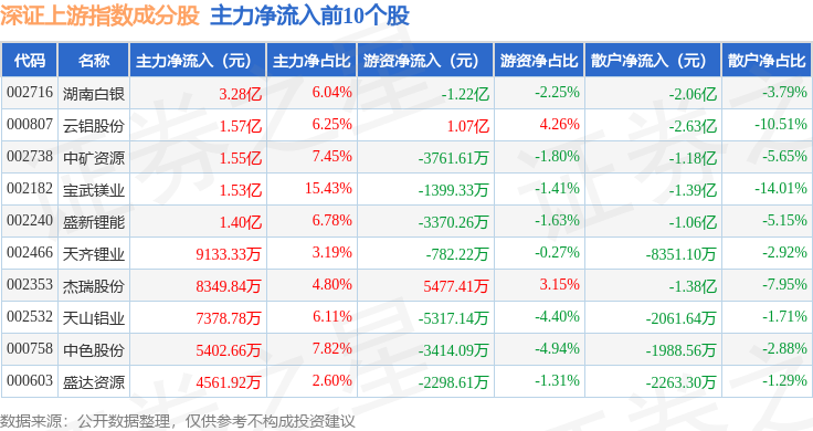 资金流向方面,深证上游(399704)指数成份股当日主力资金净流出合计17.12亿元,游资资金净流入合计7.8亿元,散户资金净流入合计9.32亿元。成份股资金流向详情见下表: