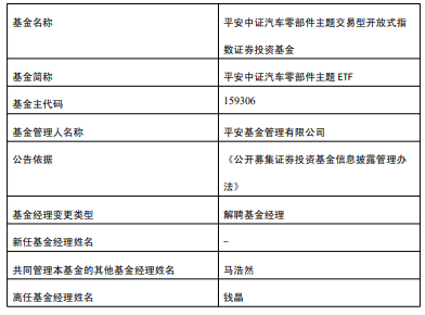 中国经济网北京1月20日讯 今日,平安基金公告,钱晶离任平安中证新能源汽车ETF发起联接、平安中证新能源汽车产业ETF、平安中证汽车零部件主题ETF。