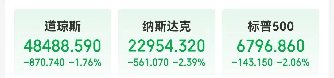 截至收盘,道琼斯指数下跌870.74点,跌幅1.76%;标普500指数下跌143.15点,跌幅2.06%;纳斯达克综合指数下跌561.07点,跌幅2.39%。