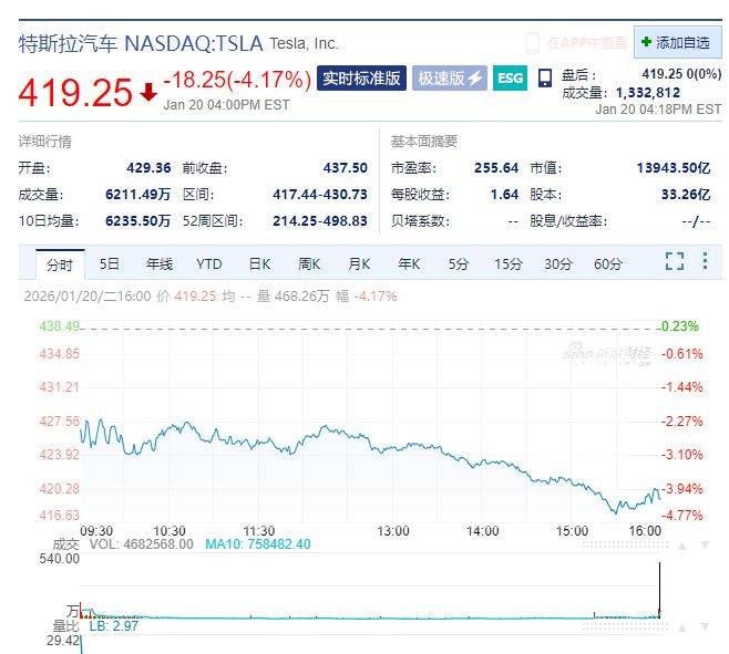 受美国最新的关税威胁影响,1月20日,美股三大指数全线大跌。