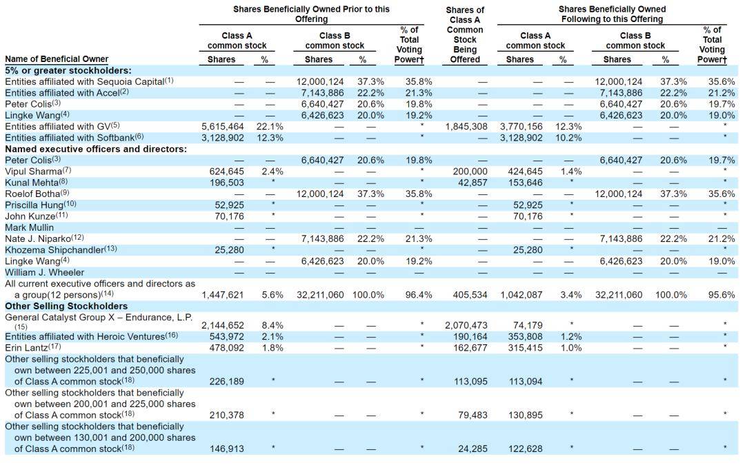 GV持有22.1%的A类股,软银( Softbank)持有12.3%的A类股,Vipul Sharma持有2.4%的A类股,General Catalyst Group X – Endurance持有8.4%的A类股,Heroic Ventures持有2.1%的A类股,Erin Lantz持有1.8%的A类股。