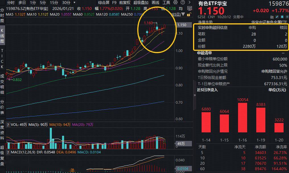 或由于上海重磅政策发布,今日(1月21日)揽尽有色金属行业龙头的有色ETF华宝(159876)强势拉升,场内价格盘中涨超2.1%,现涨1.77%,冲击日线3连阳,距离此前的上市高点(1.160)仅一步之遥。