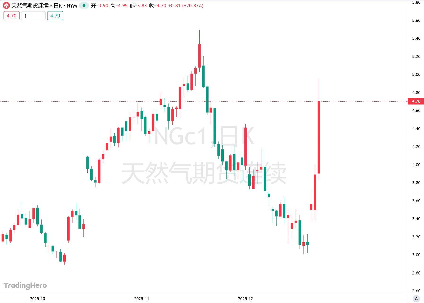 美国寒潮预警全面升级,未来数周大部分地区将迎强低温天气,天然气供暖需求激增叠加冻堵减产预期双轮驱动,美国天然气期货价格周二创四年最大单日涨幅,周三延续强劲涨势。