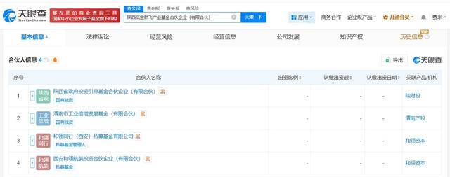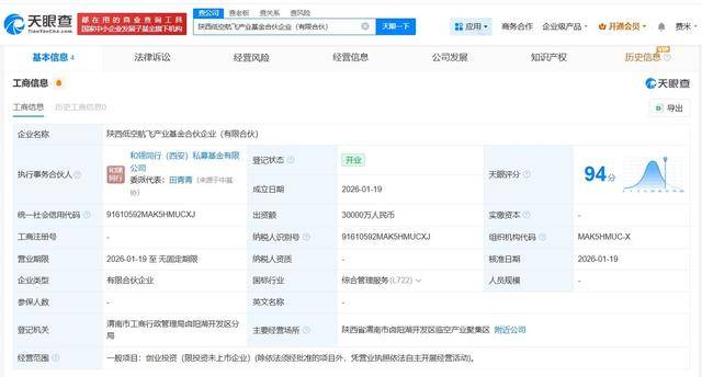 天眼查工商信息显示,近日,陕西低空航飞产业基金合伙企业(有限合伙)成立,执行事务合伙人为和翎同行(西安)私募基金有限公司,出资额3亿人民币,经营范围为创业投资,由陕西省政府投资引导基金合伙企业(有限合伙)、渭南市工业倍增发展基金(有限合伙)、和翎同行(西安)私募基金有限公司、西安和翎航装投资合伙企业(有限合伙)共同出资。