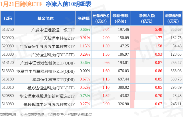 当日有38只跨境ETF基金出现资金净流入,其中净流入排首位的是广发中证港股通非银ETF(513750),份额增加了3.04亿份,净流入额为5.48亿元。