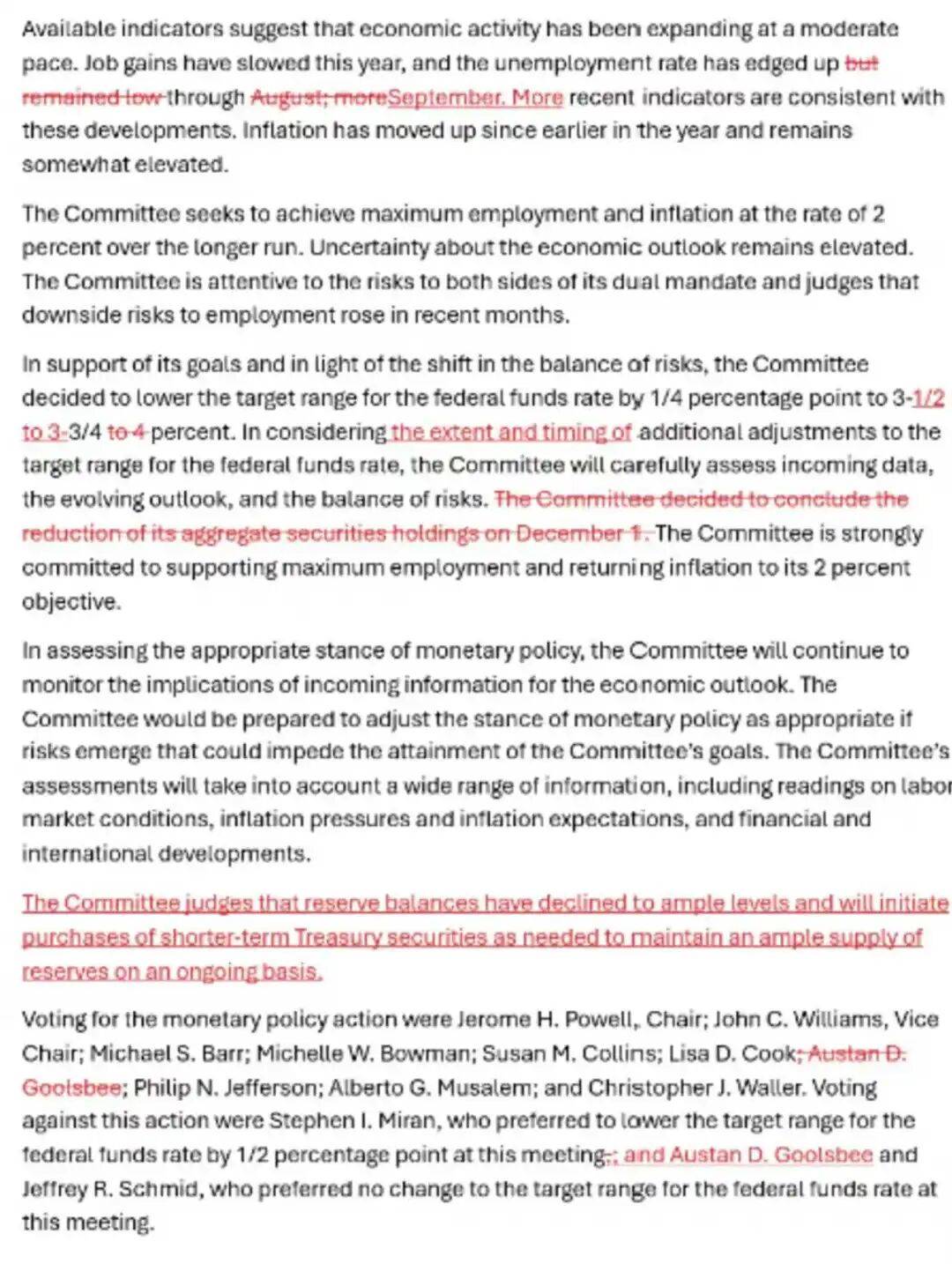 值得关注的是,美联储货币政策委员会成员在投票中再次出现了巨大分歧。其中,支持本次货币政策行动的有主席杰罗姆·H·鲍威尔、副主席约翰·C·威廉姆斯、迈克尔·S·巴尔、米歇尔·W·鲍曼、苏珊·M·柯林斯、丽莎·D·库克、菲利普·N·杰斐逊、阿尔贝托·G·穆萨莱姆以及克里斯托弗·J·沃勒;斯蒂芬·I·米兰则希望降息50个基点;而奥斯坦·D·古尔斯比和杰弗里·R·施密德则投票希望基准利率不做调整。