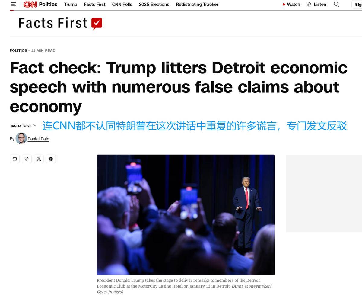 这句话被广泛解读为:如果你支持自由贸易,你就成了特朗普眼中的亲华派。这也等于是特朗普给中国作为全球自由贸易领袖的地位,打上了官方印章。不过,海外网友对特朗普的这一番言论并不买账,许多人嘲笑特朗普的倒行逆施,认为他的政策最终将损害美国经济,反而让中国受益。特朗普这番讲话的背景是,美国最高法院正在审议特朗普政府广泛使用关税大棒的合法性。他辩解称,最高法院如果裁定关税政策不合法,将会损害美国经济,而反对关税的人实际上是在帮助中国的经济利益。在底特律访问期间,特朗普还将美国-墨西哥-加拿大协议(USMCA)称为无关紧要,并表示将推动更多制造业回归美国。美国CNN网站专门撰文指出,特朗普在底特律的演讲中充满了经济谎言,并进行了事实核查。比如,他声称中国是最大的关税支付者,但实际上,美国对中国出口商品征收的关税,大部分由美国进口商和消费者承担。这也充分反映了美国国内,确实有相当一部分民众对特朗普的关税政策表示反对。