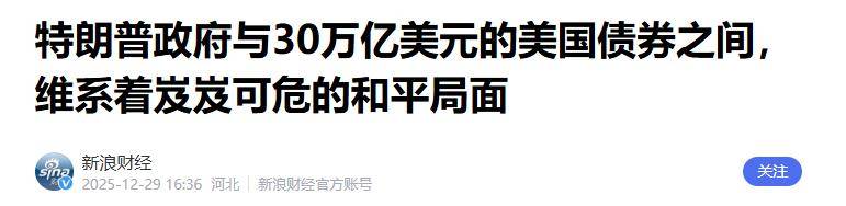 参考资料: 1.《特朗普政府与30万亿美元的美国债券之间,维系着岌岌可危的和平局面》2025-12-29 16:36 | 来源:新浪财经 2.《投资者罕见大量抛售,美债爆雷,华尔街坐不住了》2025-04-11 17:32 | 来源:环球时报 3.《央行:中国11月末黄金储备报7412万盎司》2025-12-07 10:06 | 来源:第一财经