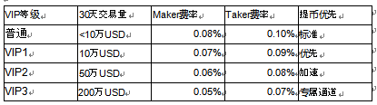 VIP等级优惠:30天交易量达100万USD可降至0.06%