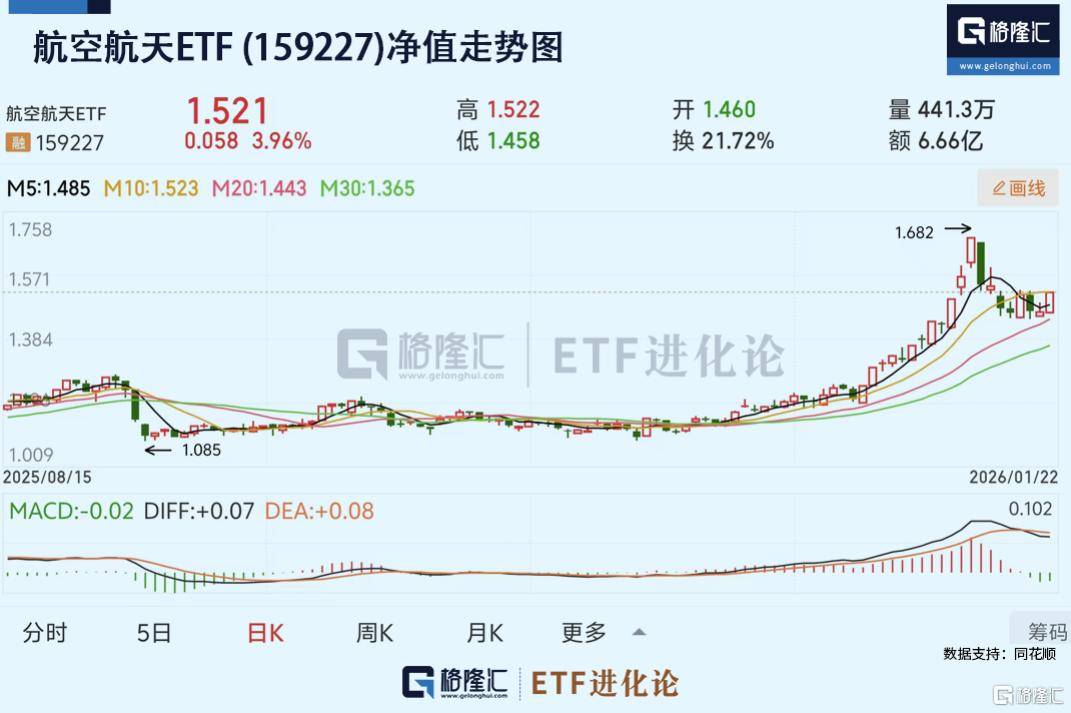 回调一段时间的商业航天板块今日强势上涨,入选“2026年全球视野·下注中国”十大核心ETF之一的航空航天ETF(159227)今日上涨3.96%,自去年5月上市以来累计上涨53.64%。