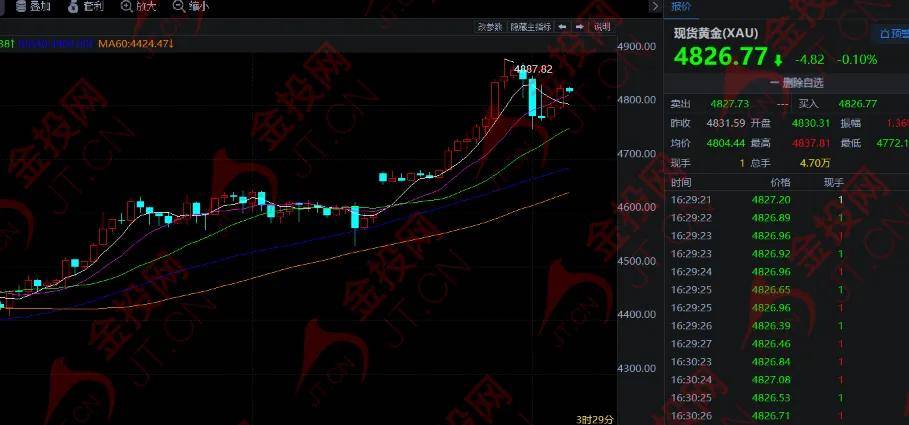 隔夜,现货黄金收盘上涨1.4%,报4830.56美元,金价盘中曾触及4888.59美元,刷新纪录高位,而在特朗普表态后,金价一度暴跌至4755.55美元。今日亚市早盘,黄金突然遭遇一波抛售,目前在4830美元附近徘徊。