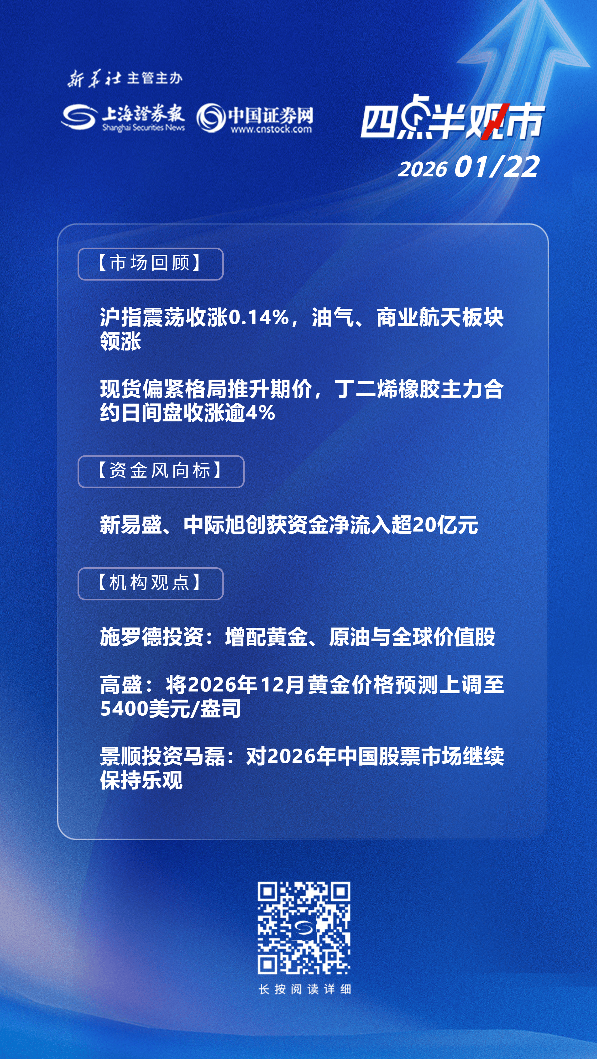 沪指震荡收涨0.14%,油气、商业航天板块领涨;现货偏紧格局推升期价,丁二烯橡胶主力合约日间盘收涨逾4%;新易盛、中际旭创获资金净流入超20亿元;施罗德投资:增配黄金、原油与全球价值股;高盛:将2026年12月黄金价格预测上调至5400美元/盎司;景顺投资马磊:对2026年中国股票市场继续保持乐观。