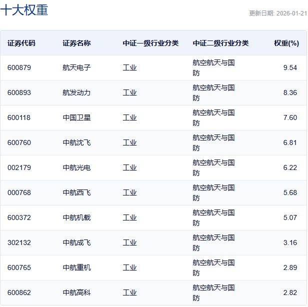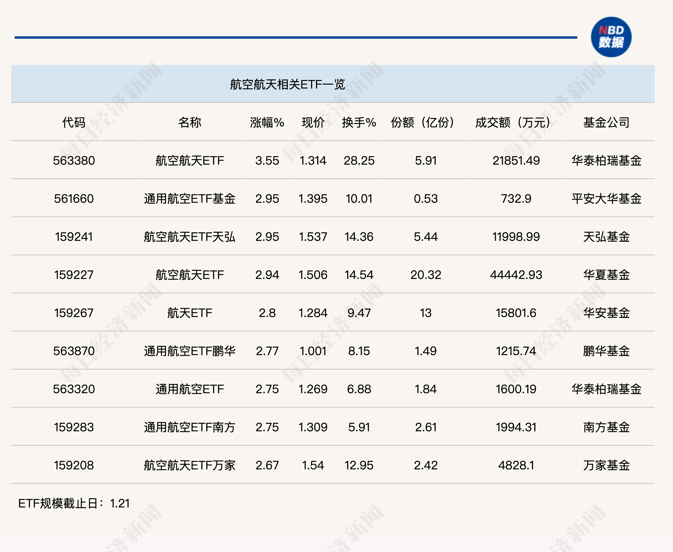 点评:航空航天ETF(563380)半日涨幅为3.55%,份额为5.91亿份,半日成交金额为2.19亿元,其追踪的是中证全指航空航天指数。中证全指航空航天指数以中证全指指数样本为基础,按中证行业分类,选取三级行业分类属于航空航天的股票作为样本。而从申万二级行业分类来看,该指数较全面覆盖航空航天产业链。