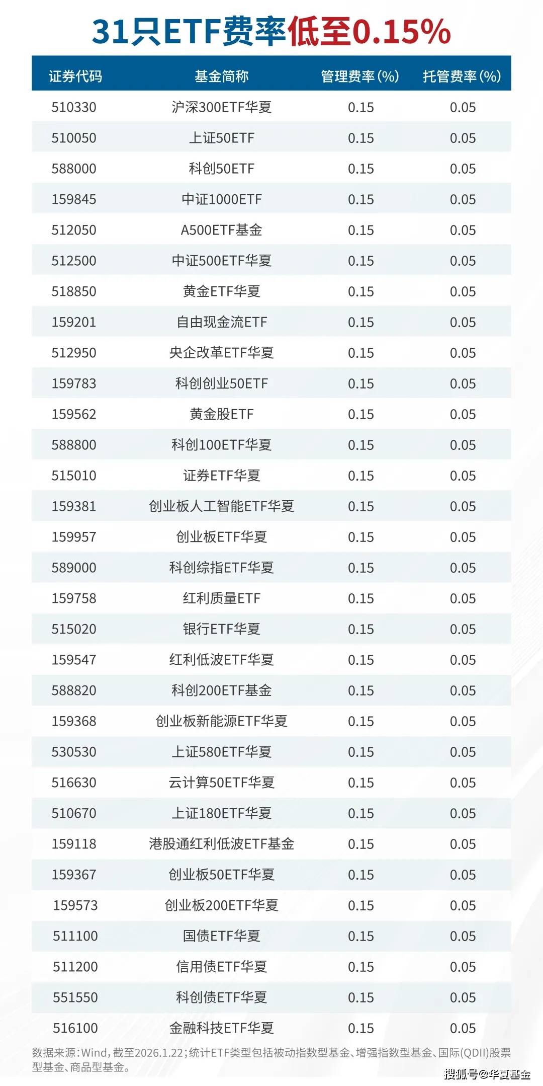 为了更好地服务广大投资者,降低投资者的理财成本,自2026年1月22日起,调低金融科技ETF华夏(516100)的管理费率、托管费率,其中管理费率将由0.50%下调至0.15%(年费率),托管费率由0.10%下调至0.05%(年费率),与联接基金一致。