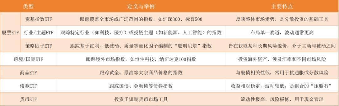 匹配风险偏好:不同ETF的风险特征差异巨大,需与自身风险偏好匹配。比如稳健投资者选货币ETF、债券ETF,激进一点的可选股票ETF、商品ETF。对于大多数投资者配置的股票型ETF,偏激进些的适合成长、周期类主题ETF,以及成长风格或中小盘风格的宽基ETF,偏稳健些的可以考虑大盘宽基ETF或者红利类主题ETF。