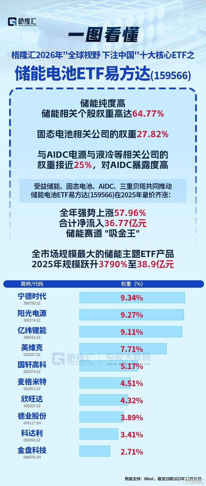 储能电池ETF易方达(159566)在2025年实现量价齐涨,全年强势上涨57.96%,规模从去年年初1亿元跃升3790%至38.9亿元,是全市场规模最大的储能相关ETF产品,2025年合计净流入36.77亿元,成为储能赛道 "吸金王",资金认可度极高。