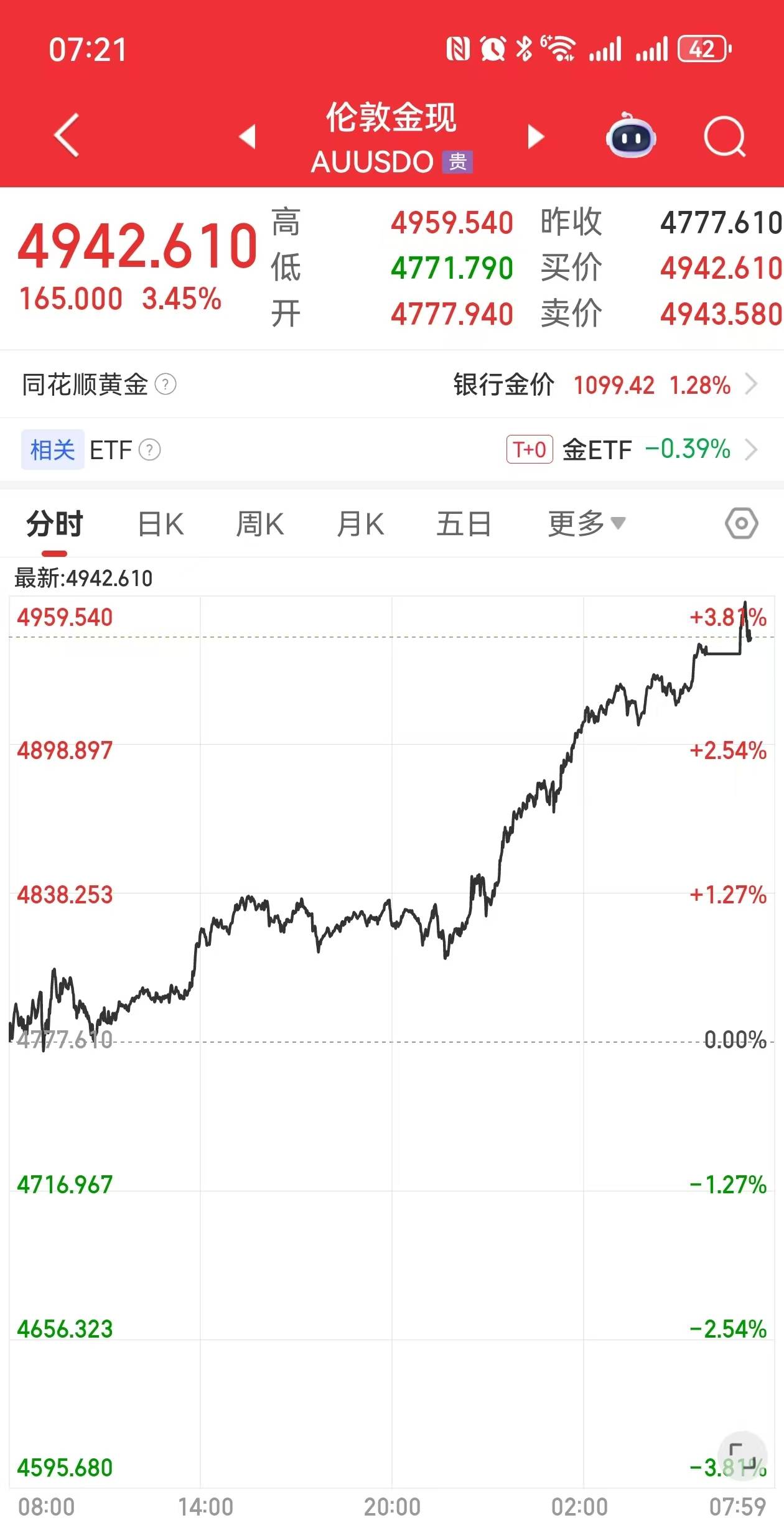 上证报中国证券网讯(记者 曾庆怡)北京时间1月23日凌晨,国际金价历史首次突破4900美元/盎司。同花顺数据显示,截至北京时间1月23日上午7时21分,伦敦现货黄金盘中最高价为4959.53美元/盎司,最新价报4942.61美元/盎司,交易日内上涨3.45%。