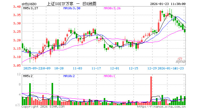 1月23日,截止午间收盘,上证50ETF万家(510680)跌0.43%,报3.246元,成交额1093.22万元。上证50ETF万家(510680)重仓股方面,贵州茅台截止午盘涨0.14%,中国平安跌0.35%,紫金矿业涨1.01%,招商银行涨0.00%,兴业银行跌0.10%,长江电力跌0.65%,寒武纪跌1.77%,中信证券跌0.14%,恒瑞医药涨0.17%,工商银行跌0.28%。
