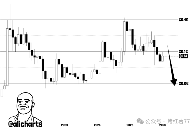 加密货币市场从不缺乏意外,而近期技术分析师 Ali Charts 发布的预测,却给备受散户喜爱的“表情包币”代表,狗狗币(DOGE)带来一阵寒意。