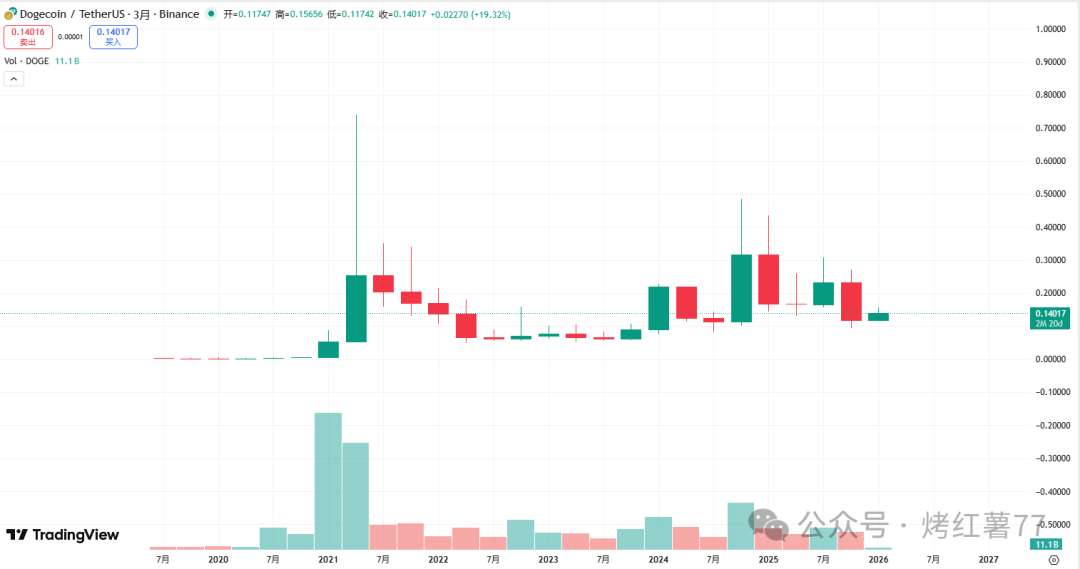 回顾历史:狗狗币从网络梗图起家,一度在 2021 年吸引大量散户入场,创下惊人涨幅,但随后价格一路回落,至今较高点已跌去 90% 以上。