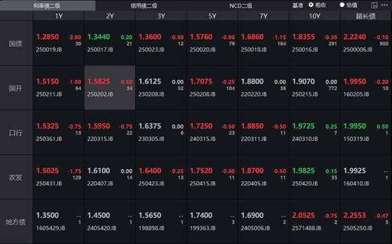 具体来看,银行间主要利率债收益率多数下行,截至下午16:30分,10年期国债活跃券250016收益率下行0.35bp报1.8355%,10年期国开债活跃券250215收益率持平报1.907%,30年期国债活跃券2500006收益率下行0.1bp至2.224%。