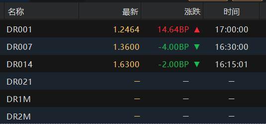 银行间回购定盘利率多数下跌。FR001跌0.08个基点报1.3592%;FR007跌7.0个基点报1.53%;FR014持平报1.85%。