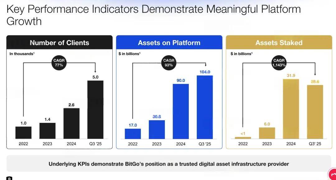 BitGo在2022年、2023年、2024年Adjusted EBITDA分别为-816.5万美元、-2973万美元、323万美元,2025年前9个月Adjusted EBITDA为2034万美元。