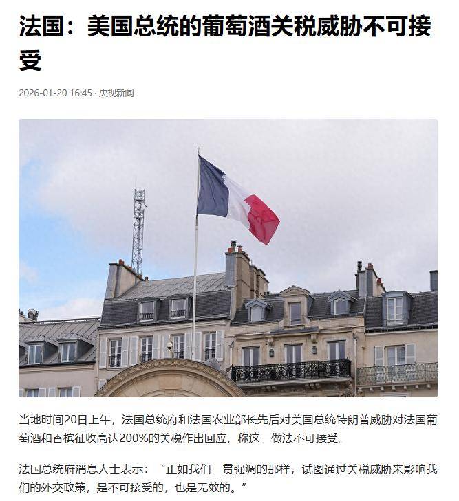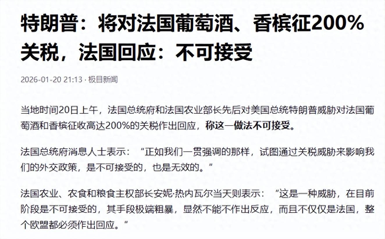 2026年刚一开年,特朗普就开始为全球上演了一场情绪化治国的精彩戏码。为了得到格陵兰岛,他不惜威胁美国的盟友;为了在加沙问题上掌握话语权,他硬是推出了一个和平委员会。而当法国拒绝配合时,他也毫不客气地将关税作为制裁工具,直接砍向法国的葡萄酒和香槟,关税一刀斩,竟高达200%。