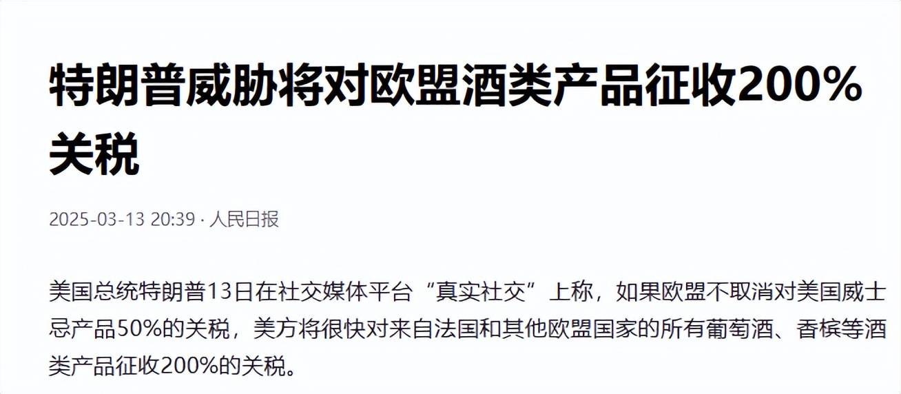 但这种做法,在欧洲显然行不通。1月19日,法国总统马克龙的态度十分坚决,明确拒绝加入这个委员会。他直言不讳地指出,该机制缺乏国际合法性,可能削弱联合国的作用,也无法真正解决加沙问题的核心矛盾。这一拒绝,直接戳中了特朗普的痛点。因为在他看来,这不仅仅是不给面子,而是等于拆台。而特朗普对拆台者的处理方式,大家都知道,那就是关税伺候。 于是,2026年1月19日深夜,特朗普彻底失控,宣布要对法国的葡萄酒和香槟征收200%的关税。理由很简单:只有这样,法国才有可能加入,但这并不是必须的。他的反应虽然迅速,但依然透露出一丝傲娇的味道。马克龙对此的回应也非常强硬,法国农业部长立即表态,这种关税威胁是不可接受的,绝对无法接受。 而法国方面为何如此紧张呢?因为酒类产业对法国来说,不仅仅是经济支柱,更是文化象征。这里不禁让人联想到2025年3月的那一轮酒类关税战。当时欧盟宣布对美国的钢铝关税进行反制,并对包括美国威士忌在内的一些商品加征关税。特朗普随即威胁称,如果欧盟不让步,他将对所有来自欧盟的葡萄酒和香槟加征200%关税。这一威胁所带来的影响不可小觑,欧盟每年向美国出口的葡萄酒超过50亿美元,而法国占据其中的近一半。 在这场关税战中,法国酿酒商的损失惨重,美国进口商纷纷裁员,波本威士忌的销售也受到冲击。全球供应链因此发生了扭曲,最终没有任何赢家。而这一次,特朗普再次重演这个剧本,只不过这次的导火索换成了加沙问题。 显然,特朗普已经把关税变成了政治惩罚的工具——不听话,就砸你最疼的地方。问题是,这种做法真的能获得胜利吗?从2025年的教训来看,答案是显而易见的:并不能。最终,大家都在为特朗普的情绪化政策买单。而全球经济也因为这些关税、贸易战而陷入了困境。