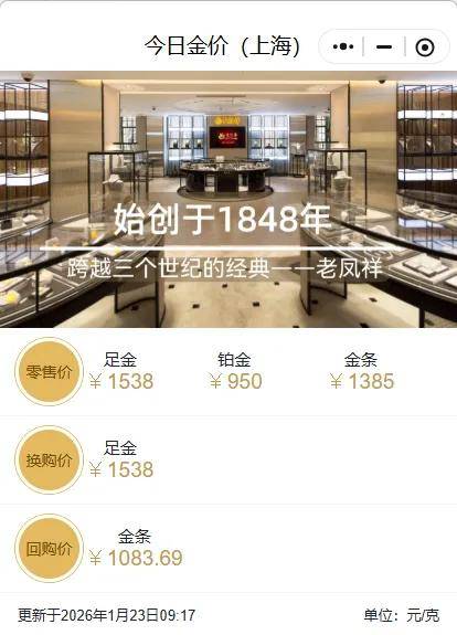 老凤祥上海会员中心小程序发布数据显示,足金饰品报1538元/克,较1月22日上涨超40元/克。