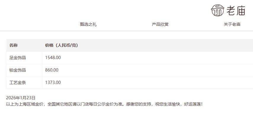 老庙黄金官网发布数据显示,足金饰品报1548元/克,较1月22日上涨超50元/克。