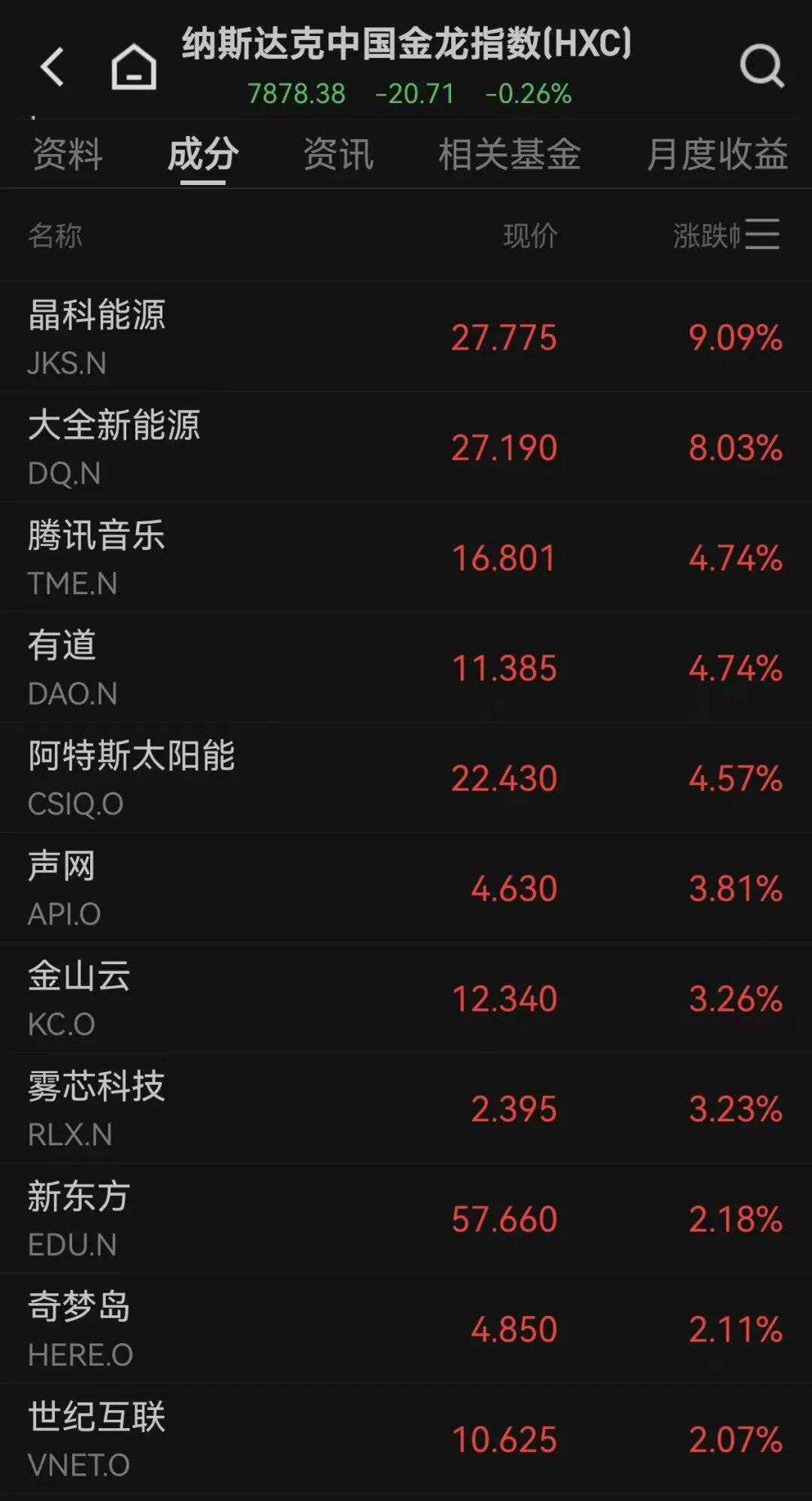 热门中概股涨跌不一,纳斯达克中国金龙指数下跌0.26%。晶科能源涨逾9%,大全新能源涨逾8%,腾讯音乐、有道、阿特斯太阳能涨逾4%;阿里巴巴、禾赛科技、爱奇艺、蔚来等跌逾2%,小鹏汽车、虎牙等跌逾3%,小牛电动等跌逾4%。