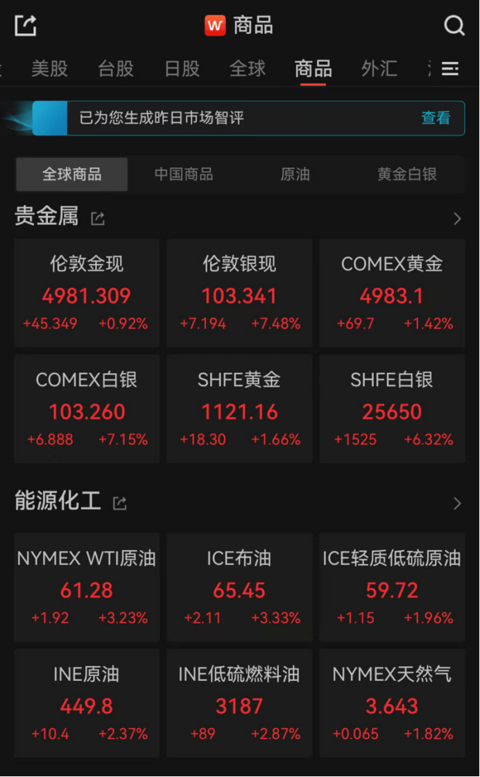 当地时间1月23日,截至收盘,伦敦现货黄金上涨0.92%,报4981.309美元/盎司;COMEX黄金期货上涨1.42%,报4983.1美元/盎司。伦敦现货白银上涨7.48%,报103.341美元/盎司;COMEX白银期货上涨7.15%,报103.260美元/盎司。此外,LME锡涨逾9%,LME镍涨近4%,LME铜涨逾2%,LME锌、LME铝均涨逾1%。
