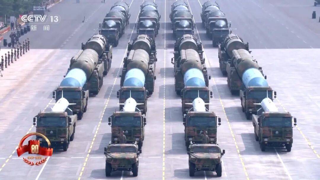 最后一个出场的方队,是由12台受阅装备车搭载着4枚东风-5C液体洲际战略核导弹组成的核导弹第二方队,东风浩荡、雷霆万钧,展现了大国重器的威武雄姿。