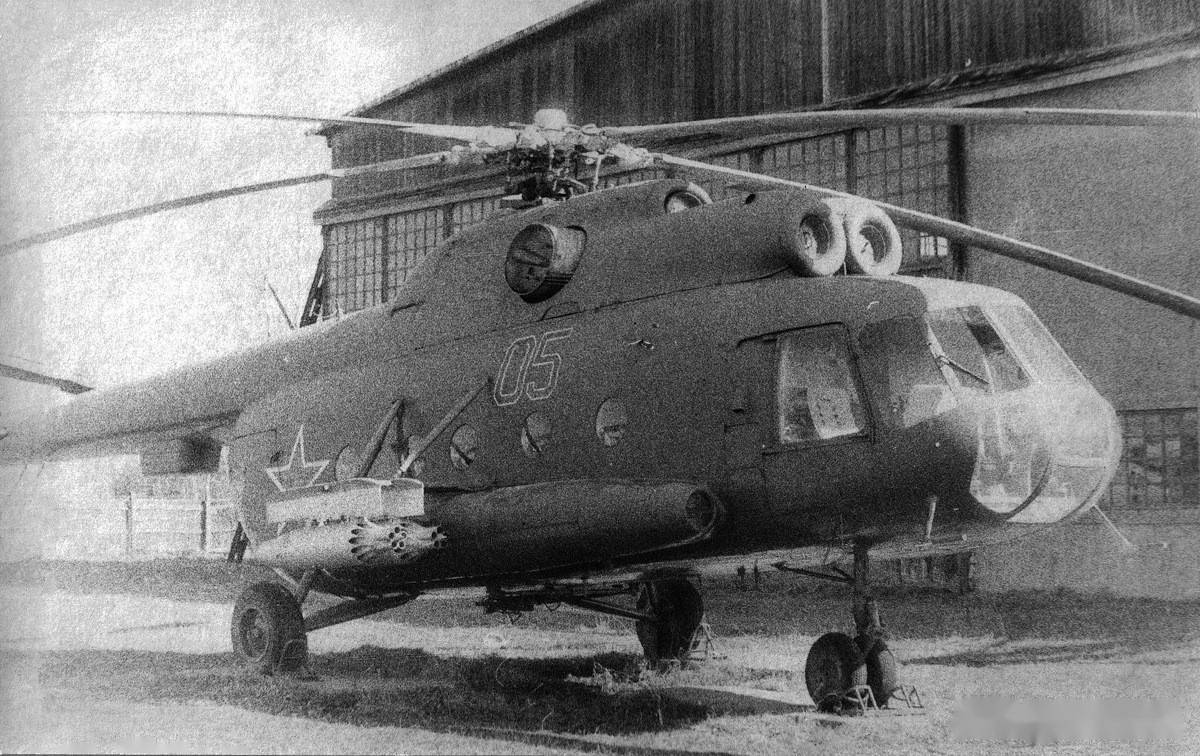 随后,摄影者的注意力被一架挂载有 无制导火箭弹(NURS)发射巢米-8 武装直升机所吸引。