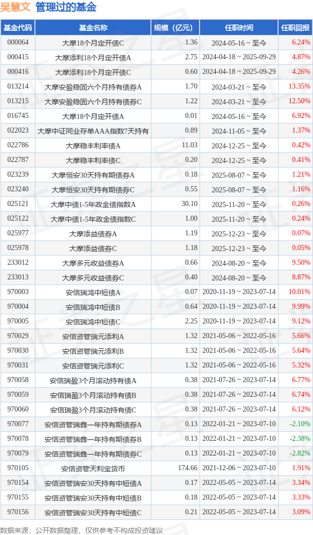 吴慧文女士:中国国籍,武汉大学金融工程专业硕士。曾任长城证券股份有限公司固定收益部投资经理,安信证券资产管理有限公司资管公募部投资主办。具有多年债券投资经验,擅长国债期货策略投资、利率债的波段操作以及信用债的价值挖掘。具备基金从业资格,并已通过基金经理证券投资法律知识考试。2020年11月19日至2023年7月14日担任安信证券瑞鸿中短债债券型集合资产管理计划基金经理。曾任安信资管瑞盈3个月滚动持有债券型集合资产管理计划基金经理。曾任安信资管瑞鑫一年持有期债券型集合资产管理计划投资经理。2022年5月16日离任安信资管瑞元添利一年持有期债券型集合资产管理计划的基金经理。2023年7月10日离任安信资管天利宝货币型集合资产管理计划基金经理。2023年7月14日离任安信资管瑞安30天持有期中短债债券型集合资产管理计划基金经理。2023年8月加入摩根士丹利基金管理(中国)有限公司,目前担任固定收益投资部总监助理兼基金经理。2024年3月21日担任摩根士丹利安盈稳固六个月持有期债券型证券投资基金基金经理。2024年4月18日至2025年9月29日担任摩根士丹利纯债稳定添利18个月定期开放债券型证券投资基金基金经理。2024年5月16日担任摩根士丹利纯债稳定增利18个月定期开放债券型证券投资基金基金经理。2024年8月20日起担任摩根士丹利多元收益债券型证券投资基金基金经理。2024年11月起担任摩根士丹利中证同业存单AAA指数7天持有期证券投资基金基金经理。2024年12月起担任摩根士丹利稳丰利率债债券型证券投资基金基金经理。2025年8月起担任摩根士丹利恒安30天持有期债券型证券投资基金基金经理。