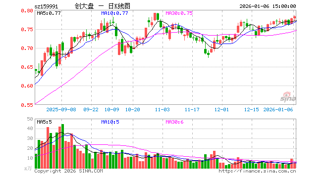 1月6日,创大盘ETF(159991)涨0.77%,成交额432.73万元。当日份额减少280.00万份,最新份额为1.36亿份,近20个交易日份额减少1680.00万份。最新资产净值计算值为1.07亿元。